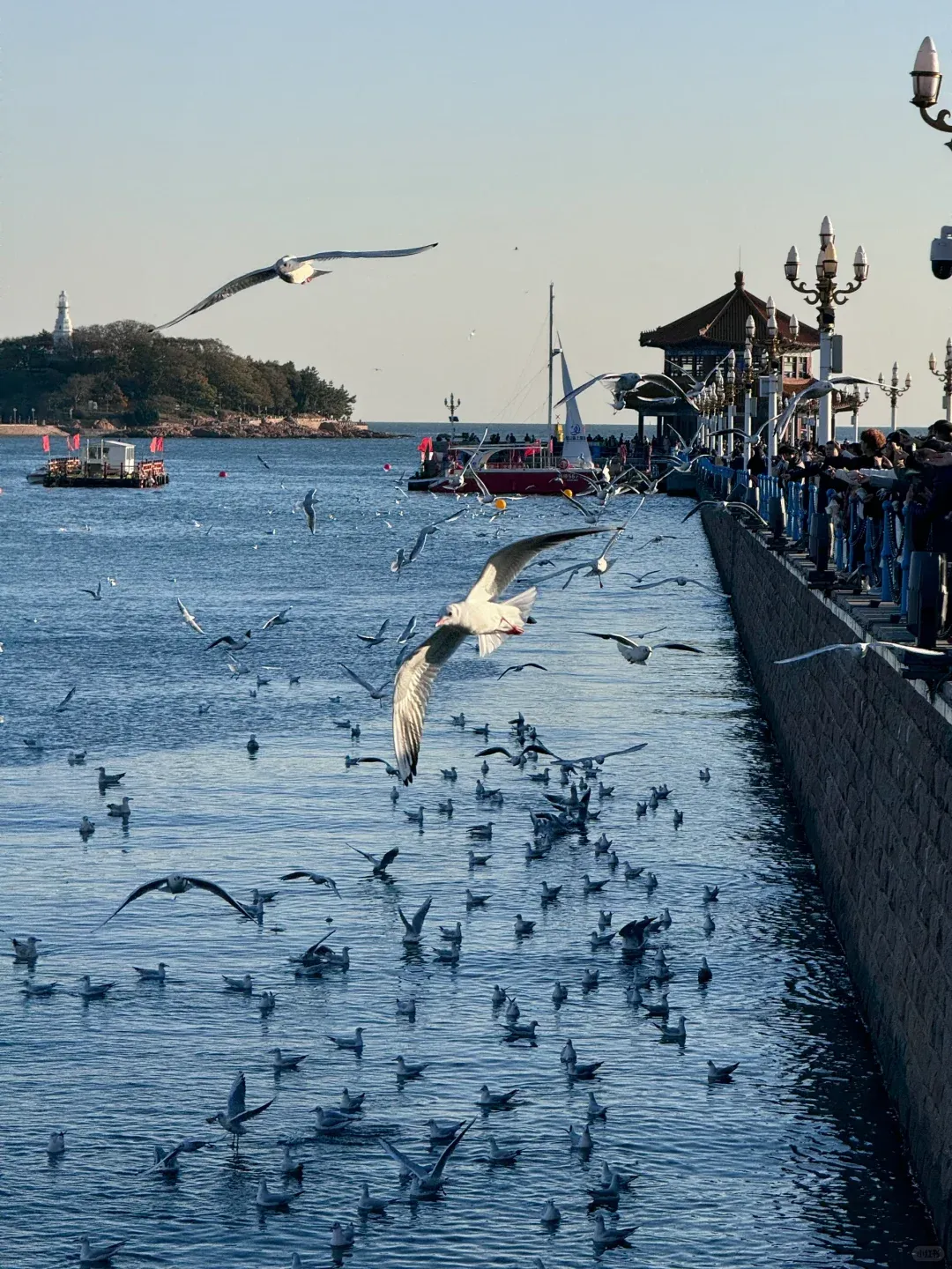 当你终于踏上栈桥,回澜阁在晨雾中静静伫立。转身望去——五四广场的红色雕塑已成远方的微小剪影。