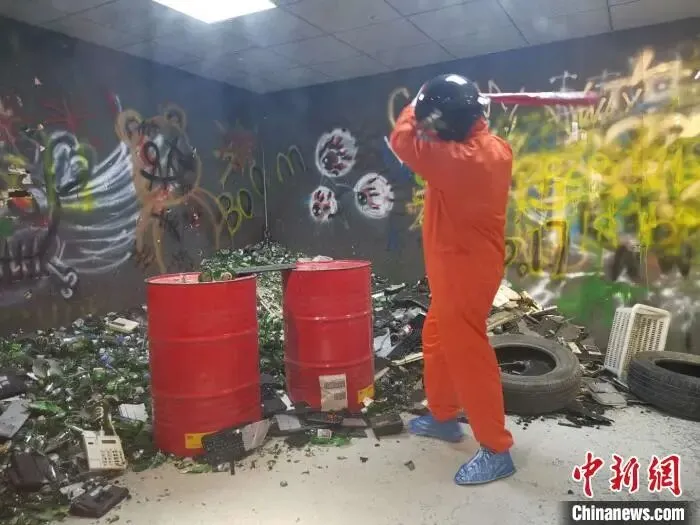 5月22日下午,记者在减压馆内看到,馆内共设30余个场景,顾客们可以通过撒钞票、摔枕头、骑单车、冥想、倾诉等多种方式进行解压。 郝学娟 摄