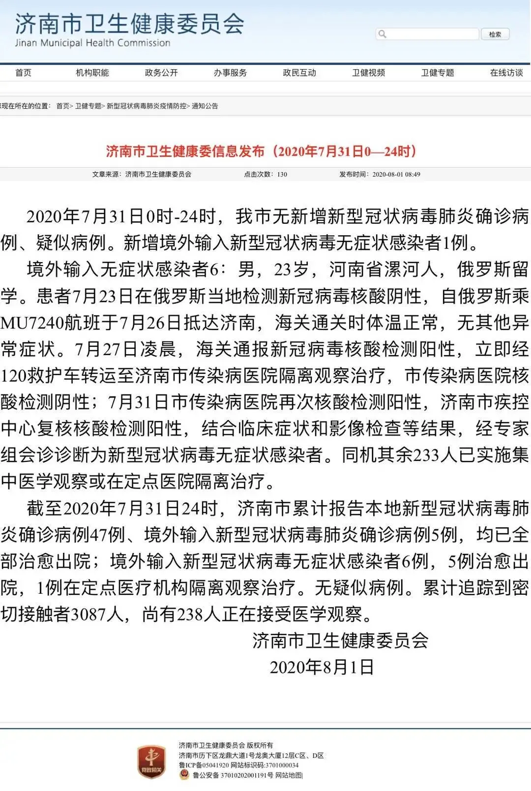 境外输入无症状感染者6:男,23岁,河南省漯河人,俄罗斯留学。患者7月23日在俄罗斯当地检测新冠病毒核酸阴性,自俄罗斯乘MU7240航班于7月26日抵达济南,海关通关时体温正常,无其他异常症状。7月27日凌晨,海关通报新冠病毒核酸检测阳性,立即经120救护车转运至济南市传染病医院隔离观察治疗,市传染病医院核酸检测阴性;7月31日市传染病医院再次核酸检测阳性,济南市疾控中心复核核酸检测阳性,结合临床症状和影像检查等结果,经专家组会诊诊断为新型冠状病毒无症状感染者。同机其余233人已实施集中医学观察或在定点医院隔离治疗。