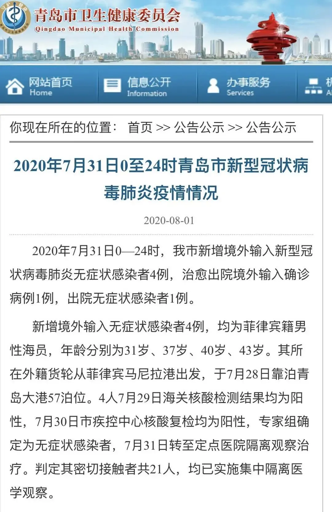 新增境外输入无症状感染者4例,均为菲律宾籍男性海员,年龄分别为31岁、37岁、40岁、43岁。其所在外籍货轮从菲律宾马尼拉港出发,于7月28日靠泊青岛大港57泊位。4人7月29日海关核酸检测结果均为阳性,7月30日市疾控中心核酸复检均为阳性,专家组确定为无症状感染者,7月31日转至定点医院隔离观察治疗。判定其密切接触者共21人,均已实施集中隔离医学观察。