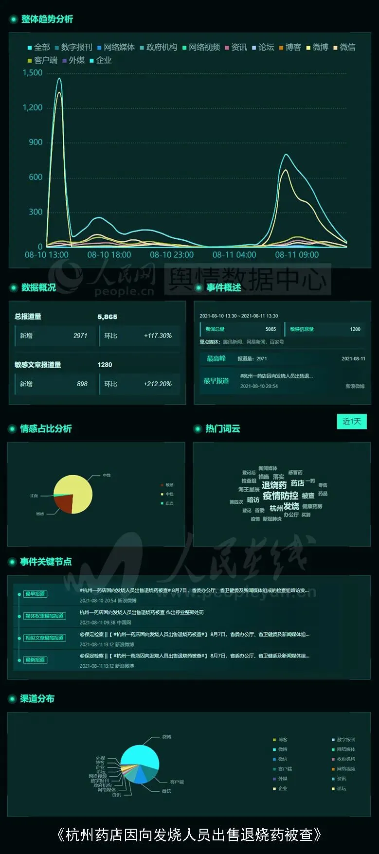 8月7日,浙江省委办公厅、省卫健委及新闻媒体组成的检查组暗访发现,上城区杭州海王星辰健康药房有限公司三新家园店存在暗访人员声明家中有发烧人员情况下,仍在登记后买到了退烧药和感冒药的情况。8月10日下午,市区两级市场监管部门对杭州海王星辰健康药房有限公司进行行政约谈,作出停业整顿处罚。话题舆情基本面如下图: