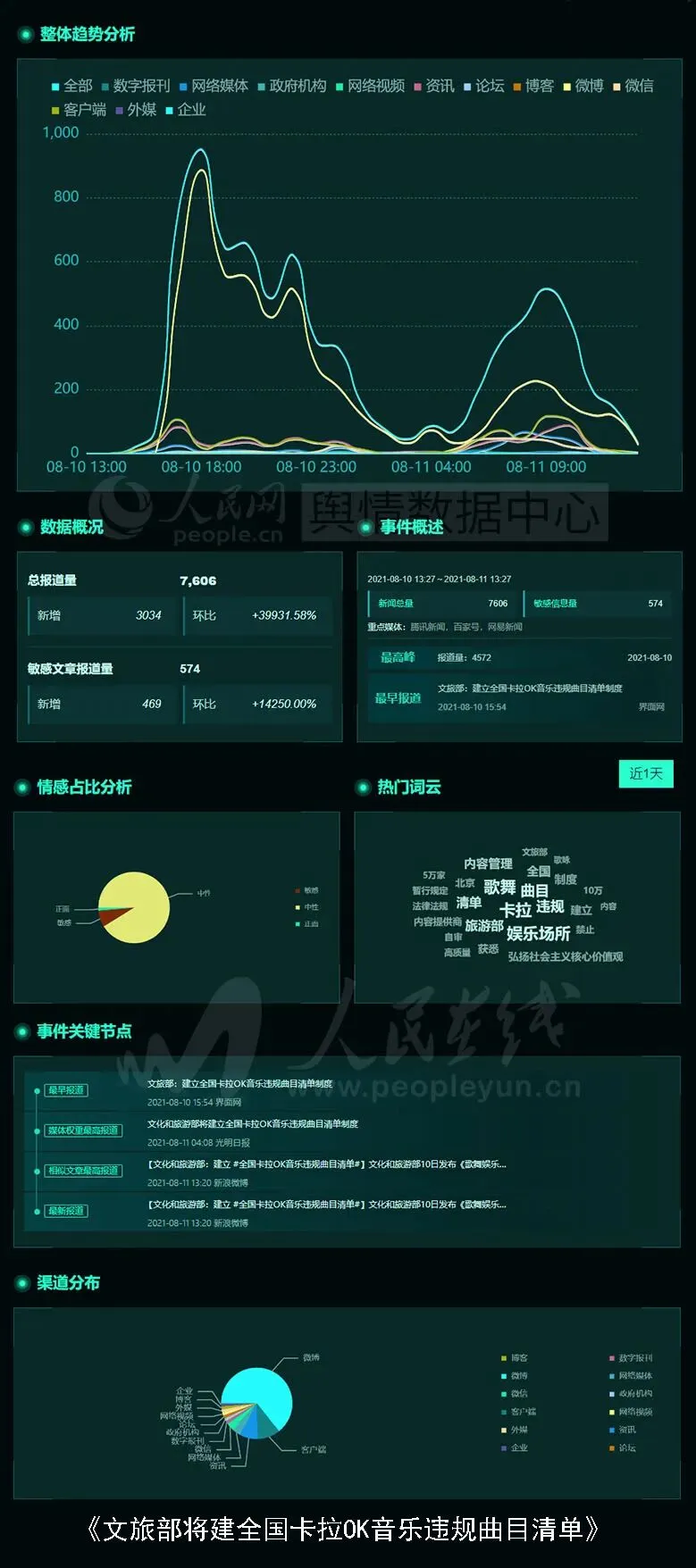 近日,文化和旅游部公布《歌舞娱乐场所卡拉OK音乐内容管理暂行规定》,自2021年10月1日起施行。规定指出,文化和旅游部负责建立全国卡拉OK音乐内容审核专家小组,建立全国卡拉OK音乐违规曲目清单制度。歌曲点播系统内容提供商、歌舞娱乐场所负责歌舞娱乐场所卡拉OK音乐内容自审等工作。迷你歌咏亭卡拉OK音乐内容管理参照歌舞娱乐场所内容管理。话题舆情基本面如下图: