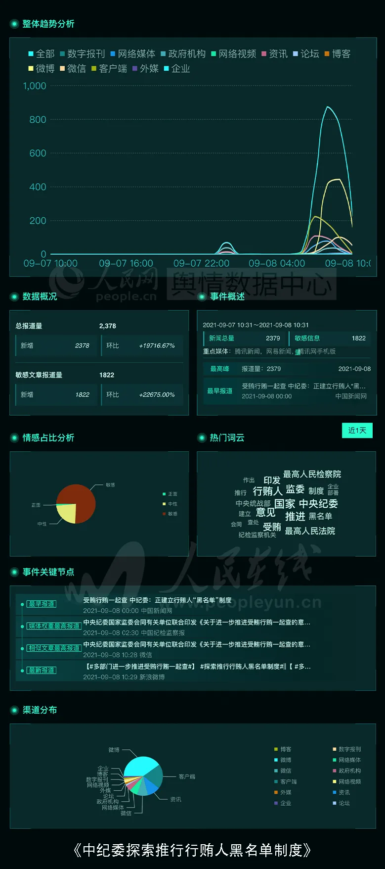 近日,中央纪委联合多部门印发《关于进一步推进受贿行贿一起查的意见》,对进一步推进受贿行贿一起查作出部署。《意见》强调,健全完善惩治行贿行为的制度规范,推进受贿行贿一起查规范化法治化;组织开展对行贿人作出市场准入、资质资格限制等问题进行研究,探索推行行贿人“黑名单”制度。此外,多次行贿巨额行贿等行为将重点查处。话题舆情基本面如下图: