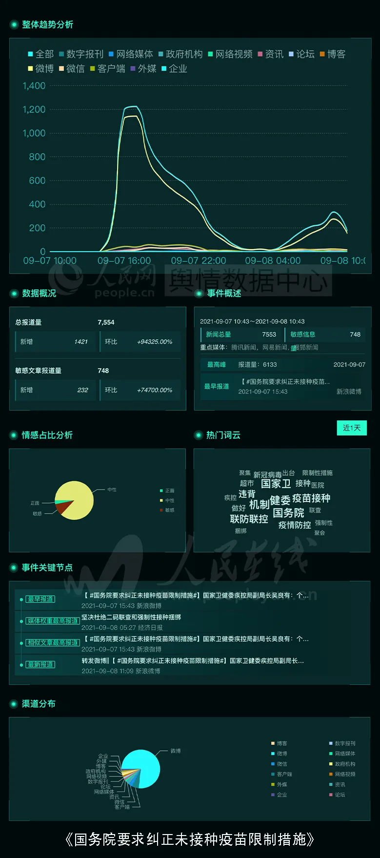 9月7日,国务院联防联控机制召开新闻发布会,国家卫健委疾控局副局长吴良表示:个别地区对未接种新冠疫苗人群不允许进入超市、医院、车站等重点公共场所,学生被拒绝入校,这些做法违背了接种原则,也给群众造成不便。针对这类情况,国务院联防联控机制综合组已要求各地予以及时纠正。话题舆情基本面如下图:
