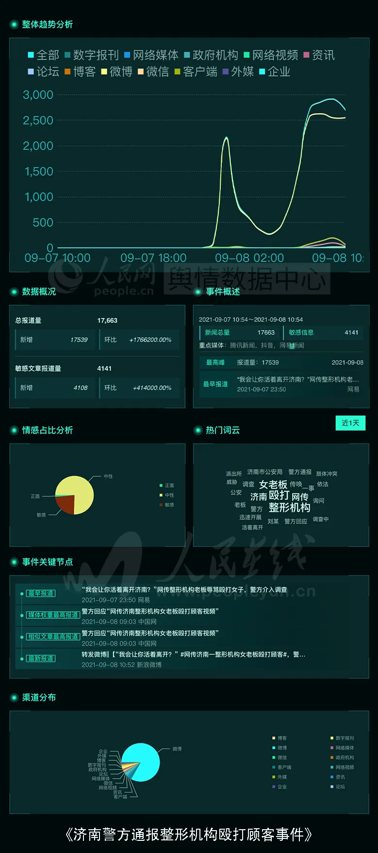 9月7日,一段济南一美容整形机构人员殴打顾客的视频,引发网友关注。7日上午,涉事整形机构发布声明称,视频中的女顾客是医闹,背后有专业的团队在操纵炒作此事,医院已经向警方反映。对于视频中自己的不妥言行,整形机构当事人已经承认错误并将积极改正。8日凌晨,济南警方发布通告称,7日下午依法传唤整形机构老板刘某明接受询问,现正在进一步调查中。话题舆情基本面如下图: