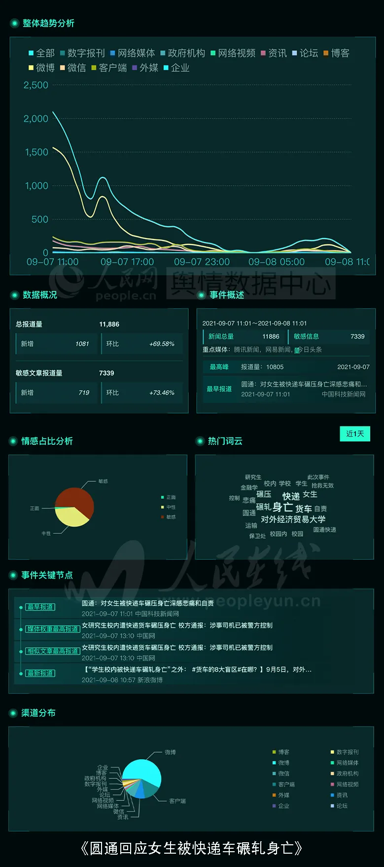 9月5日上午,对外经济贸易大学金融学研一女生在校园内被快递运输货车撞倒碾轧,送医急救无效身亡。7日,圆通方面表示,对于此次事件感到悲痛和自责,目前和北京公司成立了专门的负责小组,和加盟公司一起协助警方调查此次事件,积极配合后续的相关事宜。话题舆情基本面如下图: