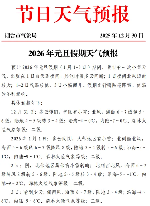 当前位置:首页>烟台>烟台有雪!元旦假期最新天气预报来了