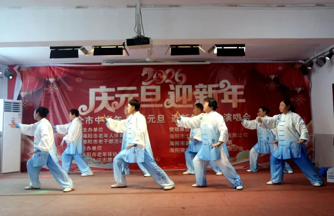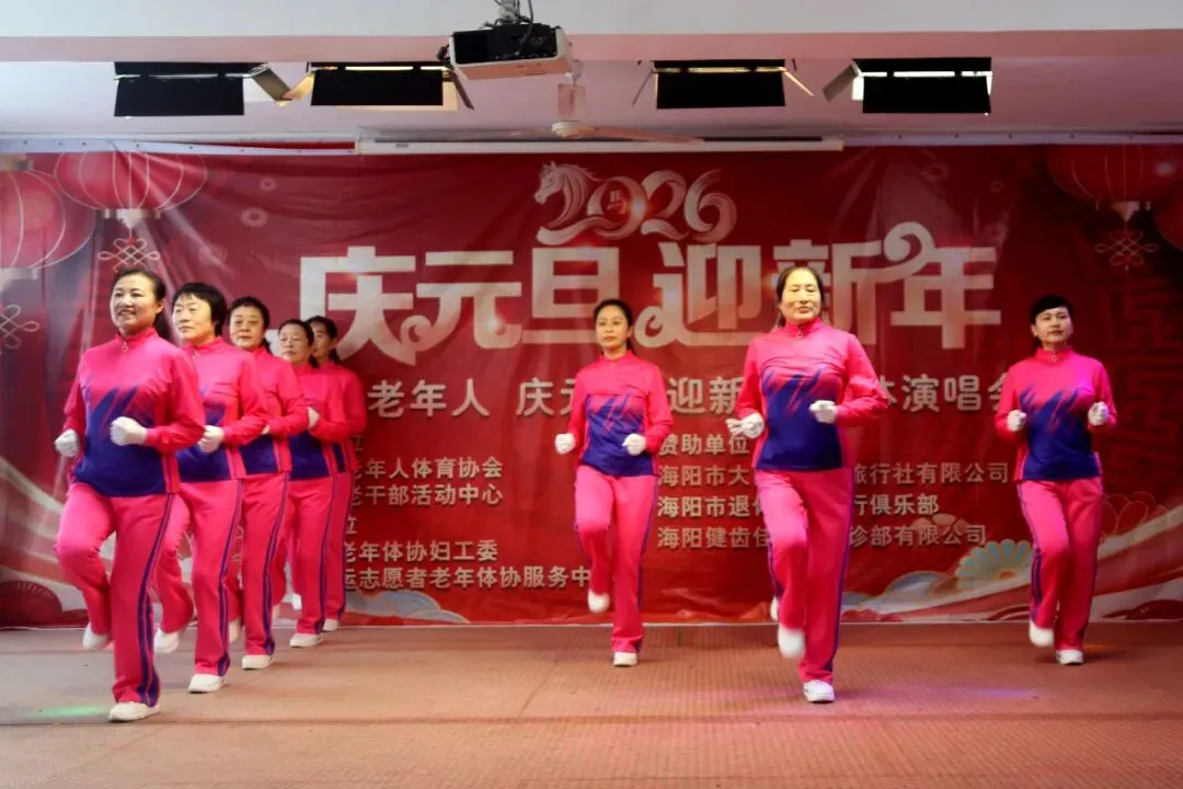 岁序更替辞旧岁,华章日新迎春晖。为营造欢乐祥和、文明健康的节日氛围,12月29日上午,由海阳市老年人体育协会、海阳市老干部活动中心主办,海阳市老年人体育协会妇工委、爱行礼运志愿者老年体协服务中心承办的海阳市中老年人“庆元旦 迎新年”文体演唱会在市老干部活动中心大礼堂精彩上演。200余名参演者欢聚一堂,以饱满的热情迎接2026年的到来,祝愿祖国明天更加美好。活动现场喜气洋洋、暖意融融,让群众提前感受到了浓浓的新年氛围。 活动在舞蹈《新春序曲》中拉开序幕,灵动的舞姿瞬间点燃全场氛围。本次活动上演了涵盖演唱、舞蹈、健身操、走秀等20多个节目,内容丰富,形式多样。参演者皆是精选的骨干人员,德艺双馨,是村居和社区文体活动的骨干和带头人。演出现场,载歌载舞,一首首歌曲或高亢激昂或深情婉转,唱出了对祖国母亲的爱恋和祝福;一支支舞蹈或大气磅礴或灵动优美,舞出了对美好生活的赞美和追求,让观众领略到了中华传统文化的魅力,激发了爱党爱国的情怀,充分展现了海阳市中老年体育文化的蓬勃活力与丰硕成果。