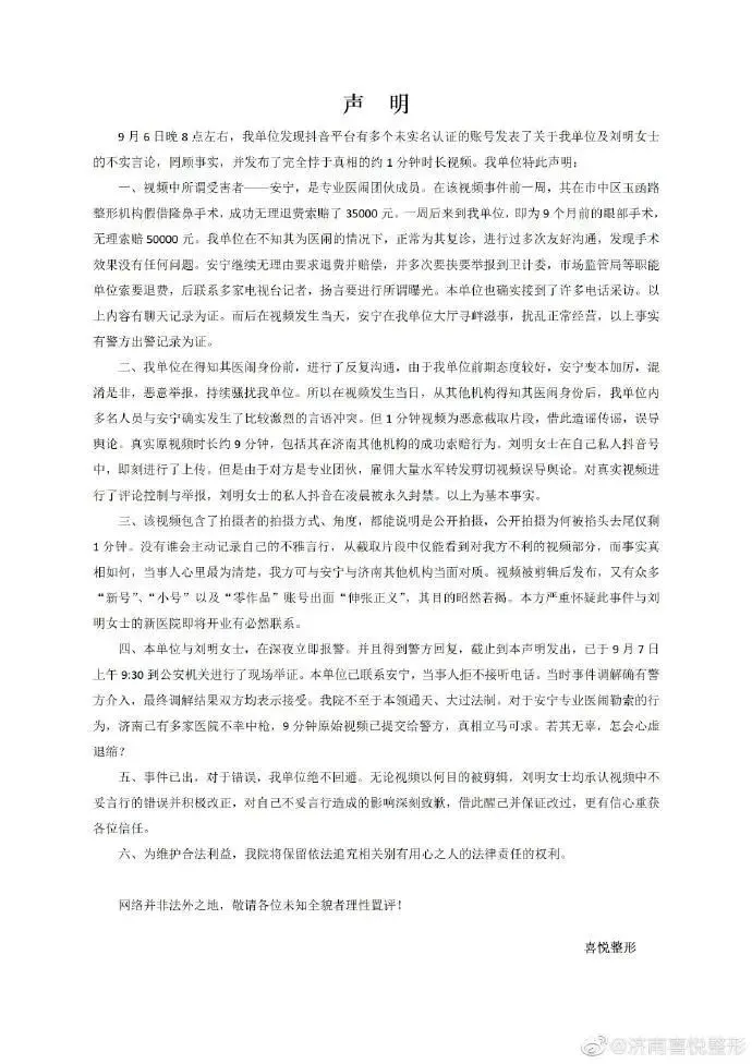 已关注 关注 重播 分享 赞 视频详情 据济南公安微博9月8日凌晨消息,针对“网传济南一整形机构女老板殴打顾客的视频”一事,济南市公安局高新技术产业开发区分局迅速开展工作,积极联系被殴打顾客,2021年9月7日下午依法传唤刘某明接受询问,现正在进一步调查中。【此前报道】 已关注 关注 重播 分享 赞 视频详情 此前,一段“济南一美容整形机构女老板殴打顾客”的网传视频引发关注。网传视频显示,早前,济南高新区喜悦整形医院内,一女顾客因整容手术失败投诉至市场监管部门。之后,该顾客被喜悦整形一女性股东殴打,威逼其签订和解协议,并恐吓其不许继续投诉。视频中,女老板“威胁”女顾客称,“我会让你活着离开济南吗?……你想想,我能让你好过?”对此,9月7日,简介为“济南喜悦整形医院官方微博”的@济南喜悦整形 微博发布声明回应称,视频中那名女顾客安某是医闹,背后有专业的团队在操纵炒作此事,此事医院已经向警方反映。对于视频中自己的不妥言行,整形机构当事人已经承认错误并将积极改正。