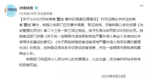 针对近期社会关注的乘客“霸座”事件,中国铁路济南局集团有限公司官方微博8月24日发布“关于G334次列车乘客‘霸座’事件的调查处理情况”。