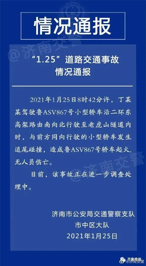 据通报,2021年1月25日8时42分许,丁某某驾驶鲁ASV867号小型轿车沿二环东高架路由南向北行驶至老虎山隧道内时,与前方同向行驶的小型轿车发生追尾碰撞,造成鲁ASV867号轿车起火,无人员伤亡。目前,该事故正在进一步调查处理中。驾驶车辆时,一定要提高安全意识,保持安全车距;行驶过程中一旦遇到汽车冒烟,有烟味、明火出现的话,不要惊慌,马上靠路边停车、熄火断电。在停车后应迅速离开车厢到安全的位置,并拨打119寻求帮助。在保证自身安全的情况下,如果火势较小、可先查看火情,拿车载灭火器灭火。若火势较大时不要勉强,等候消防救援。