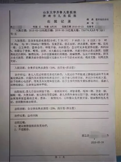 济南市儿童医院出院记录显示全身可见多处烫伤创面,共约20%。 受访者供图