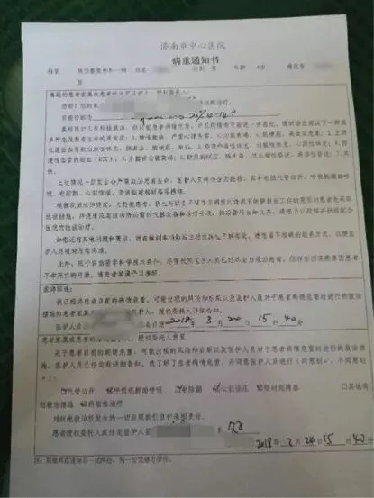 当日,腾腾在济南市儿童医院紧急包扎处理后住进监护室,次日通过120急救转入济南市中心医院烧伤外科治疗。转入济南市中心医院后,医院开具了病重通知书。