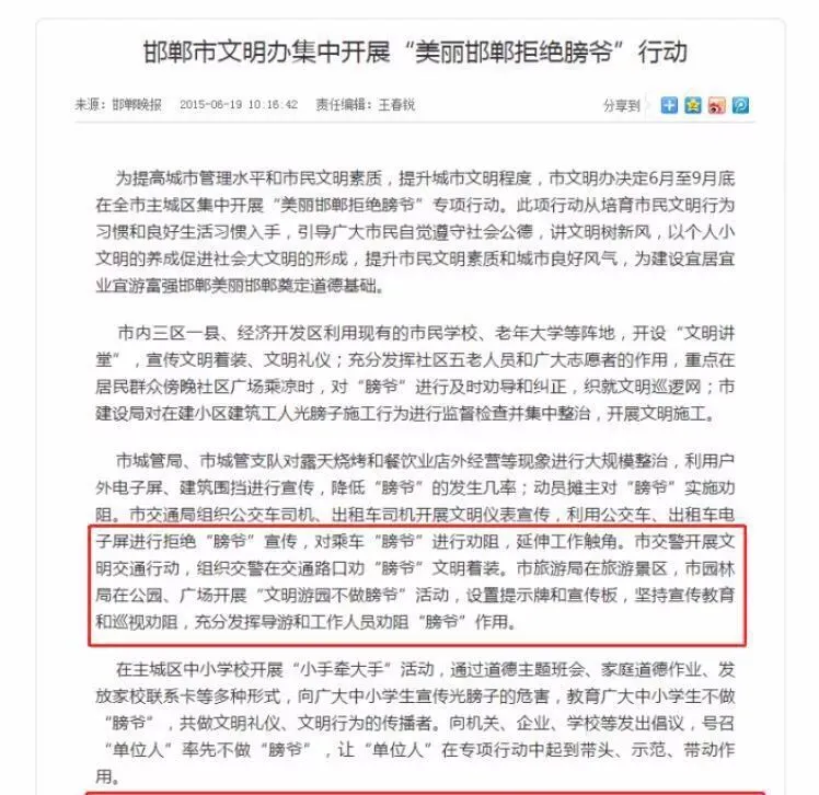 据沈阳当地媒体报道,早在2015年,沈阳市文明办、市城建局等相关部门就曾在全市开展陋习大整治。强调个人在公共环境中的不文明行为,包括光膀子、街头烧烤、路边随意躺卧等,陋习或被管理部门处罚,并抄报单位。河北邯郸城管也开展过“美丽邯郸拒绝膀爷”专项行动。