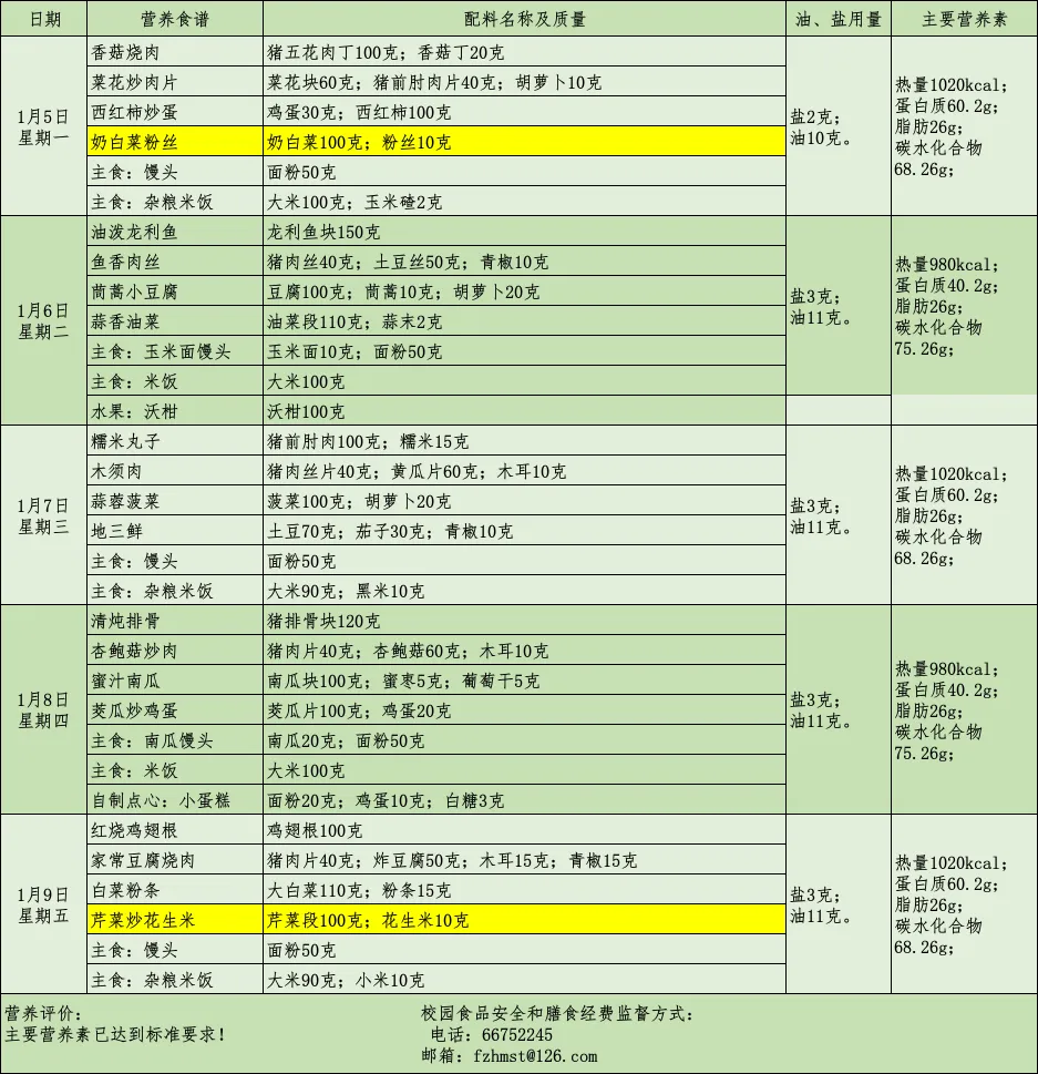 各位家长:为了让您全面了解学生在校的用餐情况,我校学生“营养食谱”特通过官方微信提前发布。学校每周“营养带量食谱”确保膳食安全、营养、均衡、充足,满足孩子健康成长需要,敬请家长关注。食谱所公示菜品原则上不做改动,若因市场原料或其他不可预见因素变化,将会根据实际情况做出最优调整,敬请谅解。标注黄色部分为“三减”菜品,祝大家用餐愉快!