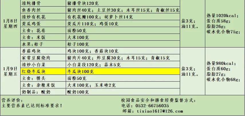 以上菜品会根据原料组织情况或其它不可预见因素可能会做调整,敬请谅解!标注黄色部分为“三减”菜品。祝各位师生用餐愉快!