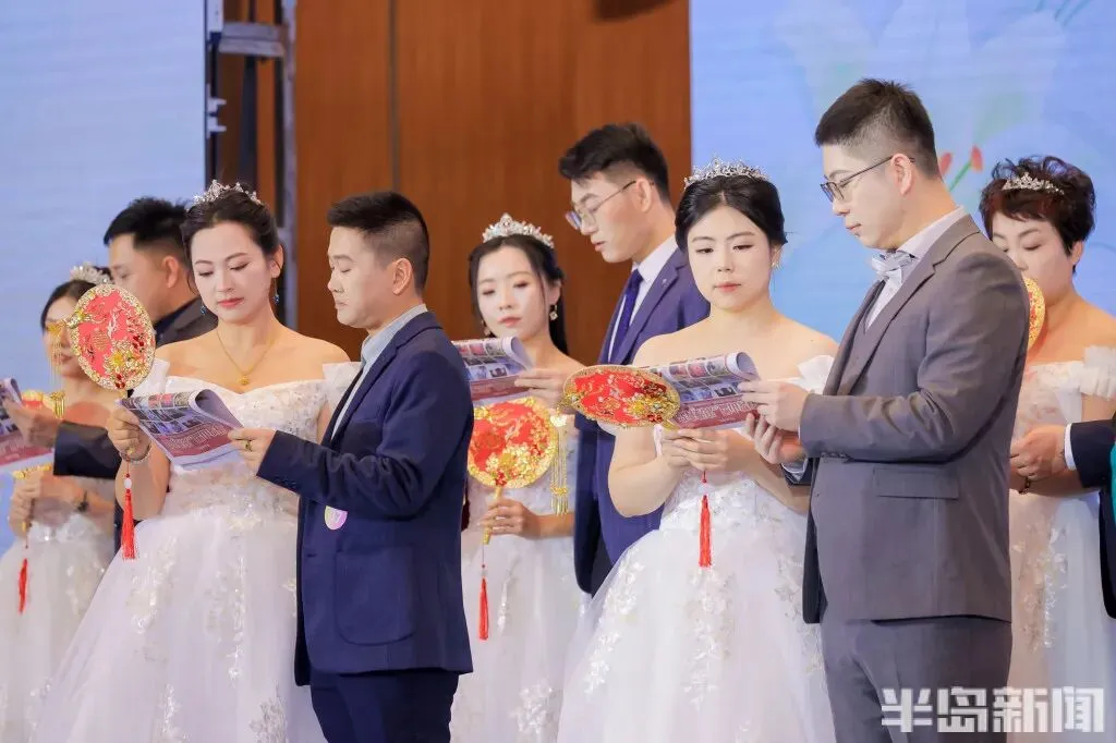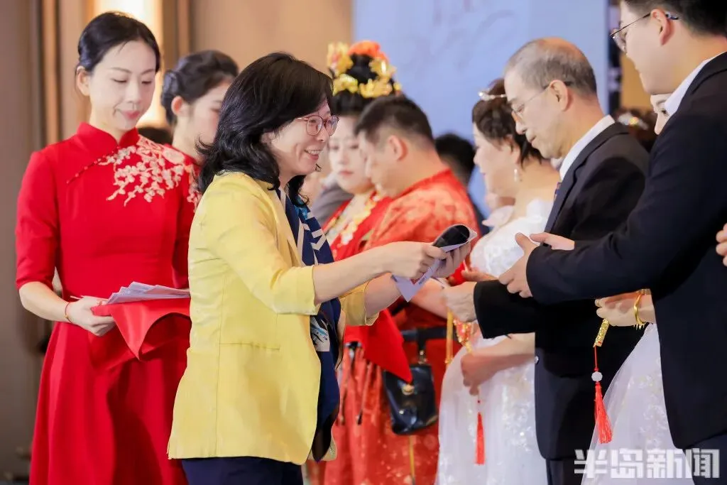 证婚人、半岛都市报社副总经理徐燕华向新人致以诚挚祝福:“青岛的浪漫,是刻在骨子里的。‘海誓山盟’不仅是一句成语,更是这座城市为爱情许下的最美诺言。今天,你们站在这里,让个人的幸福与城市的浪漫同频共振。仪式后,无论是海上巡游还是空中告白,青岛的山海都将成为你们爱情最磅礴的见证。你们今天的选择,本身就是一种美好的新风尚。集体婚礼简约而隆重,凝聚了亲朋的目光和社会的祝福。愿你们从此刻起,不仅经营好小家的幸福,更能成为文明新风的践行者与传播者。”
