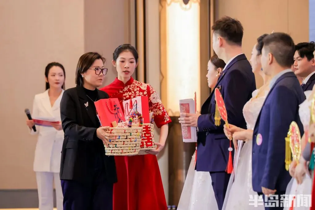 活动方还为新人准备了文旅大礼包,包含婚纱、喜扇、红包、徐福记糖果、非遗草编筐、非遗花饽饽、手绘长卷等礼品。青岛市甜蜜经济产业协会会长李晓洁女士为新人一一送上大礼包,祝福他们永浴爱河,百年好合!
