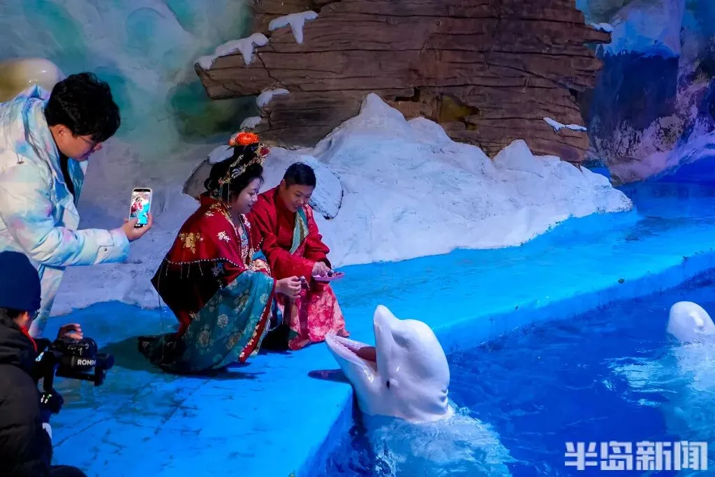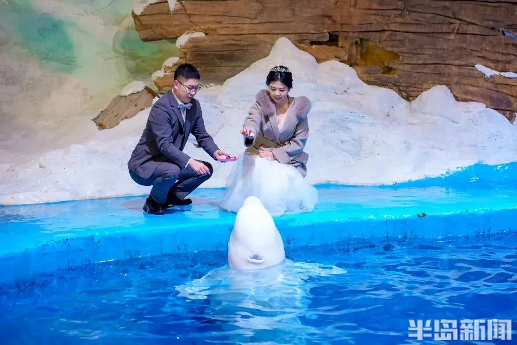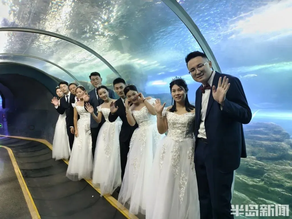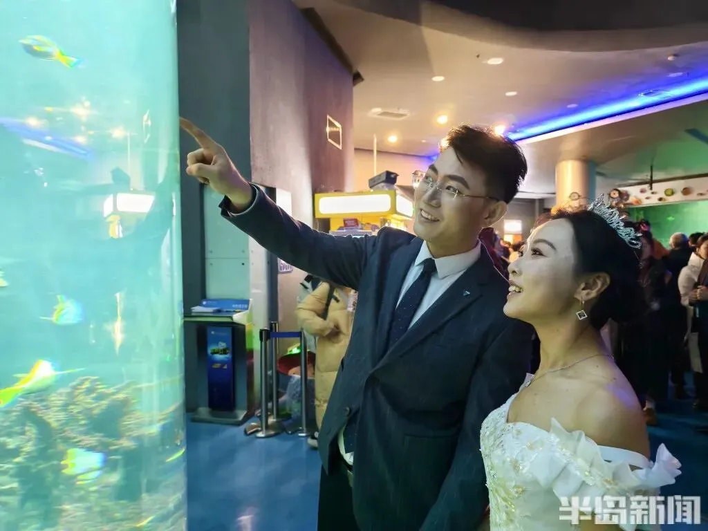 抵岸后,他们步入了神秘的青岛海底世界分会场,沉浸式观赏成群游弋的海洋生物与如梦似幻的海底奇景,并在专属拍照点留下与海洋精灵共舞的婚纱影像。