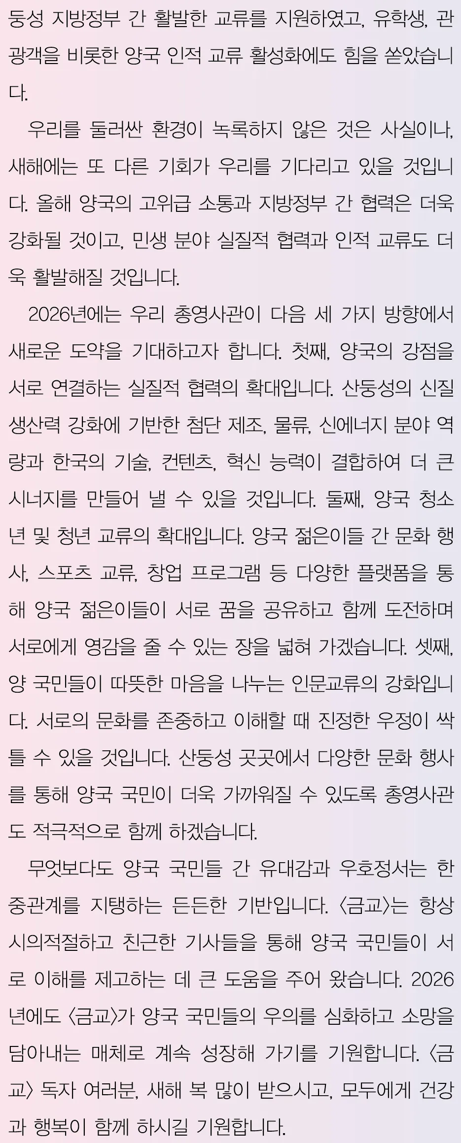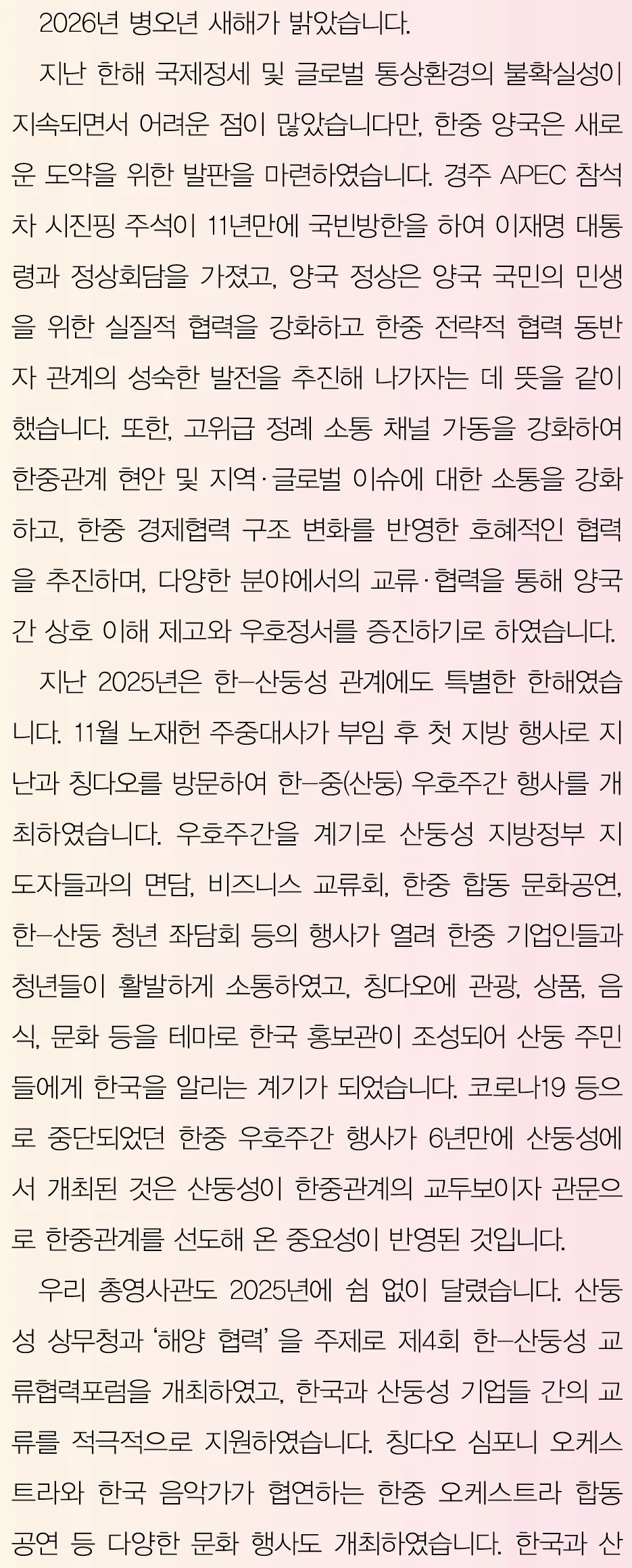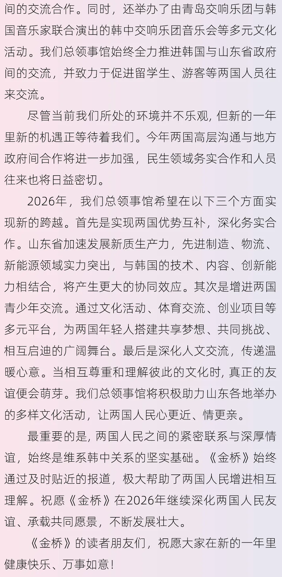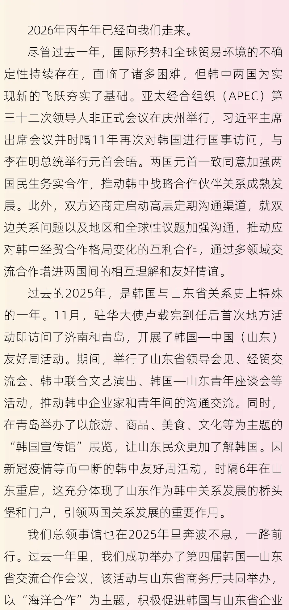 >大韩民国驻青岛总领事柳昌秀通过《金桥》杂志发表2026年新年贺词