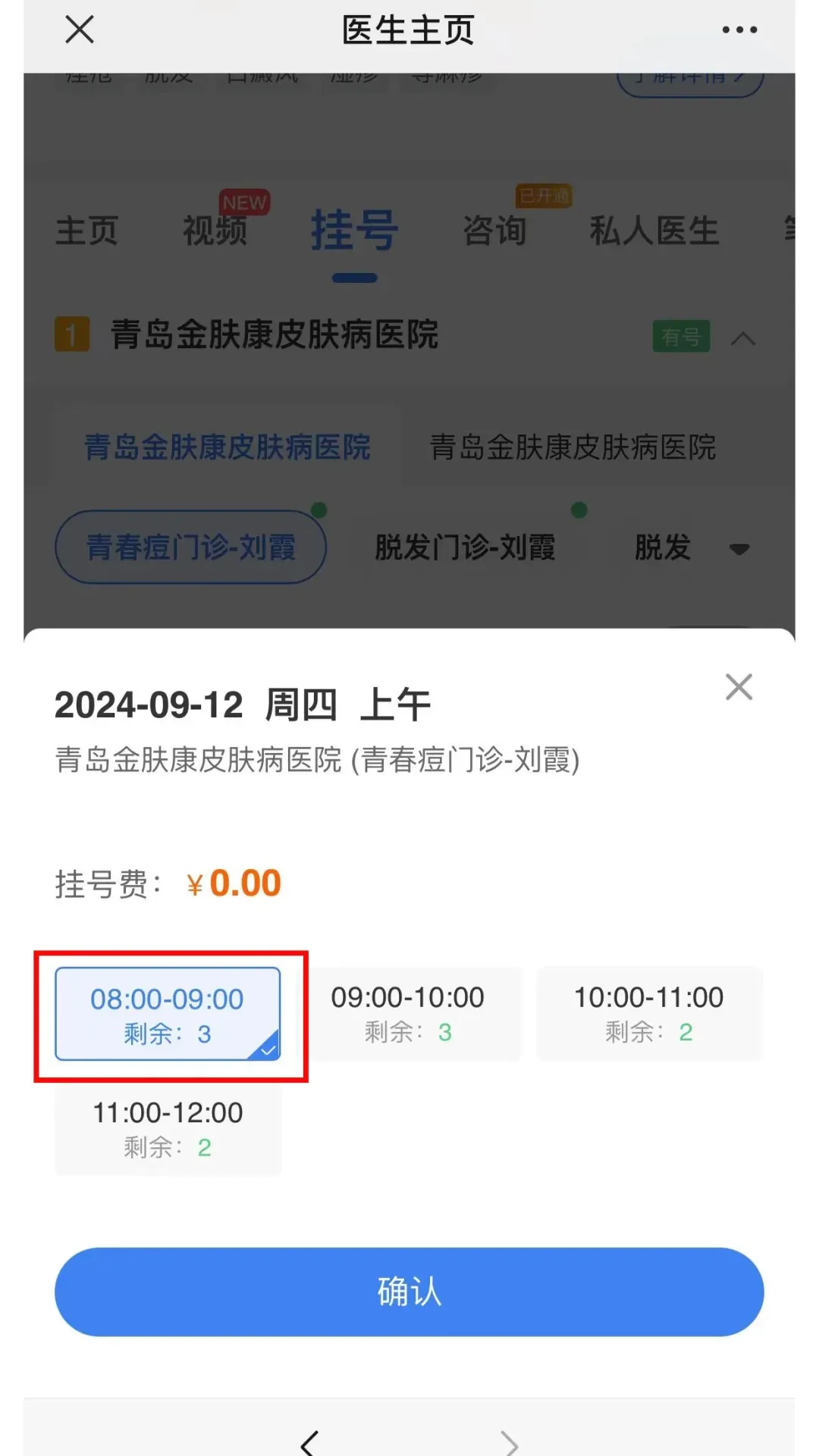 ①进入挂号页面,按需求选择科室及医生,选择预约时间,确认预约信息。