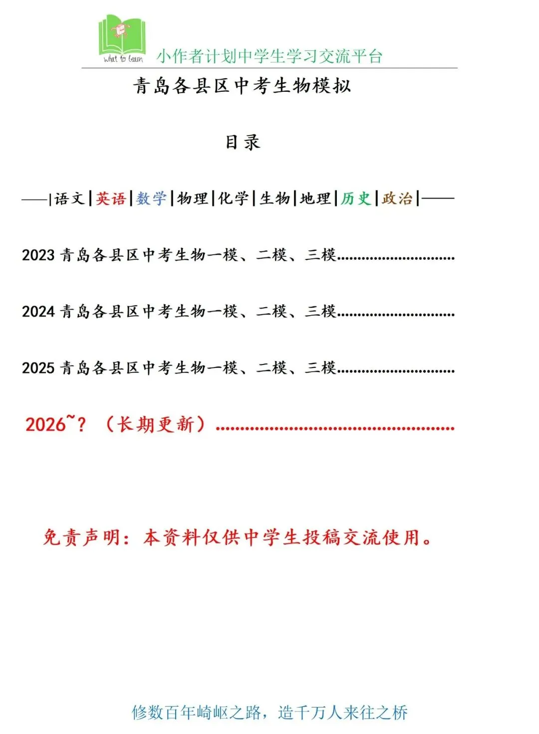 青岛各县区中考生物一模、二模、三模试题及答案暨2026中考复习刷题参考资料
