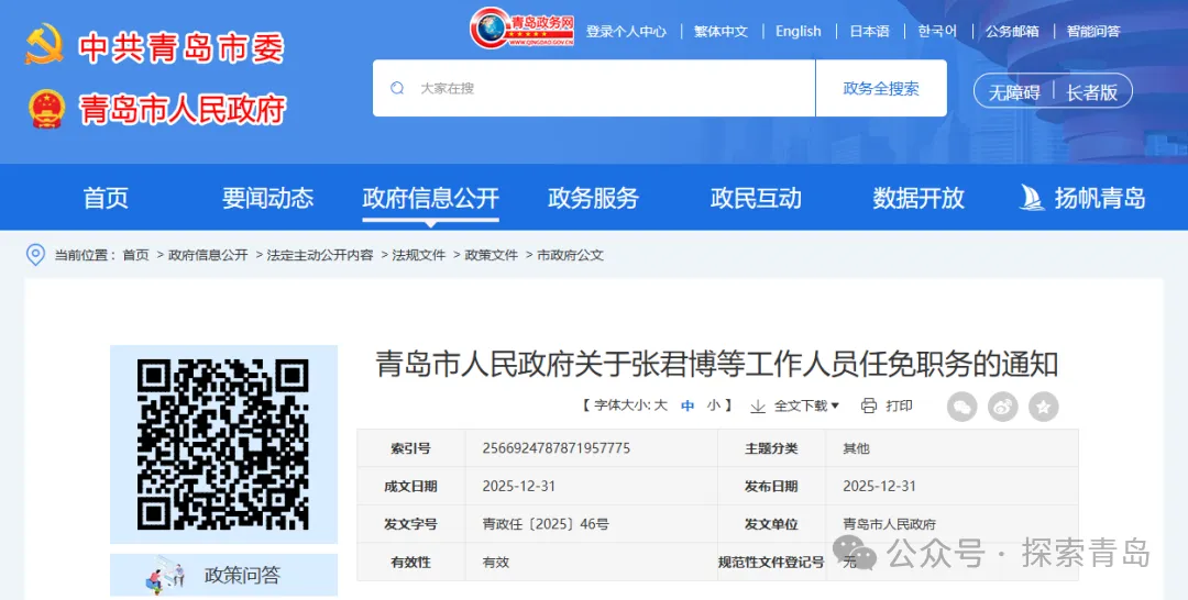 2025年12月31日,市政府决定,任命: