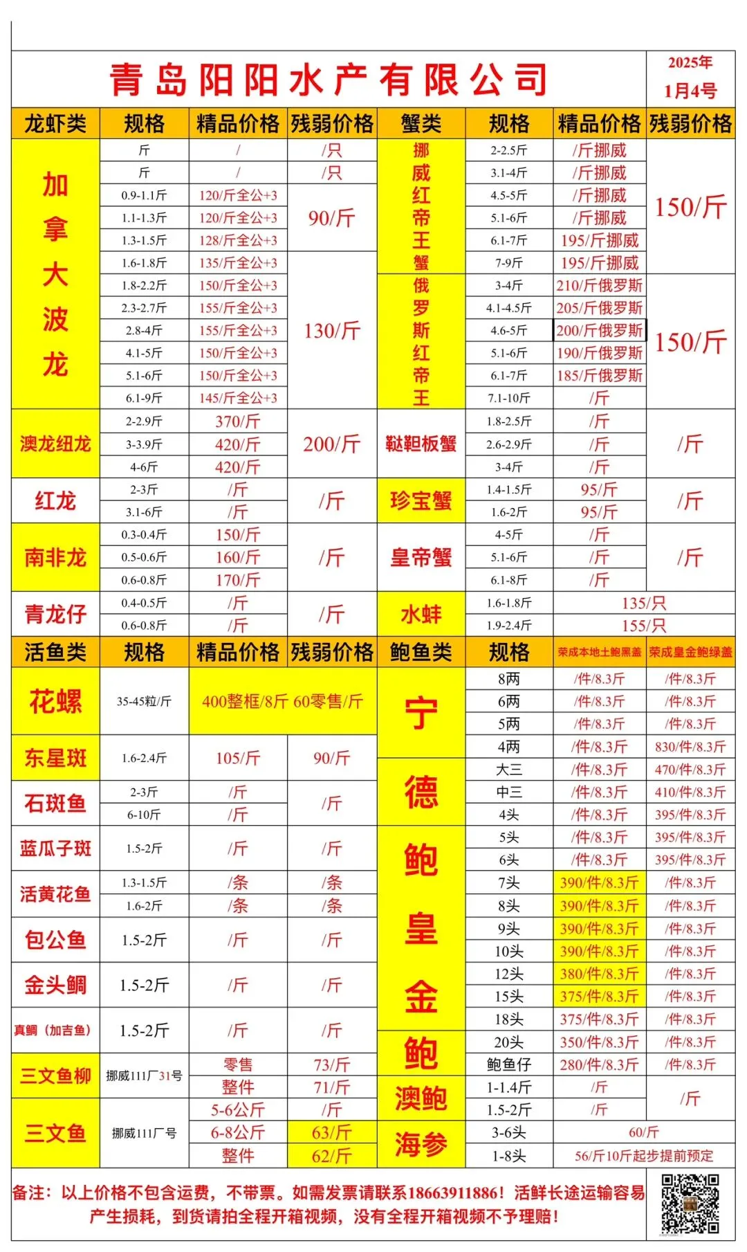 >青岛阳阳水产有限公司2026年1月4号活鲜冻品报价