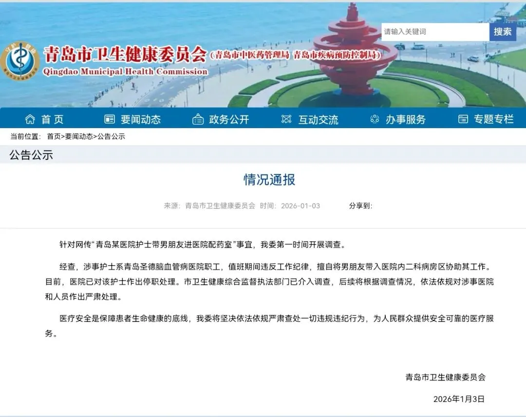 1月3日,青岛市卫生健康委员会发布情况通报称,针对网传“青岛某医院护士带男朋友进医院配药室”事宜,该委第一时间开展调查。