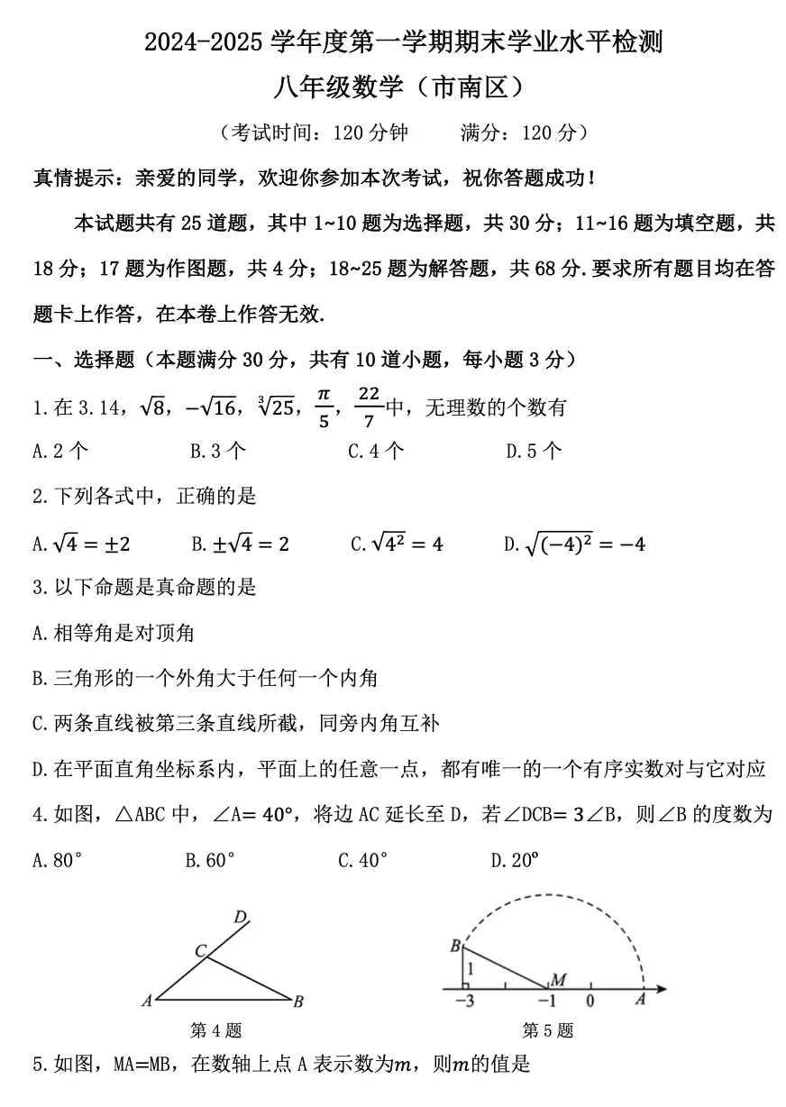 青岛市市南区八年级2024-2025学年第一学期期末数学试题