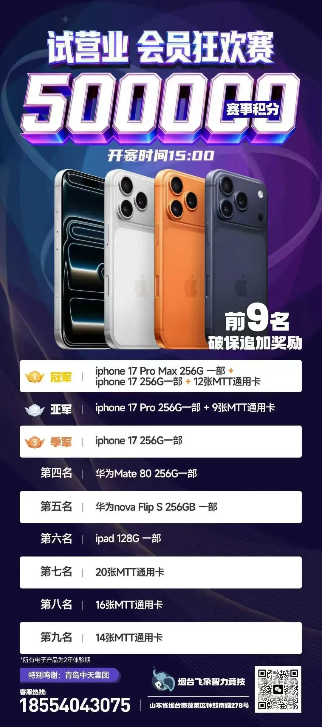 🏆冠军:iPhone17ProMax 256G+iPhone17 256G+12张MTT通用卡