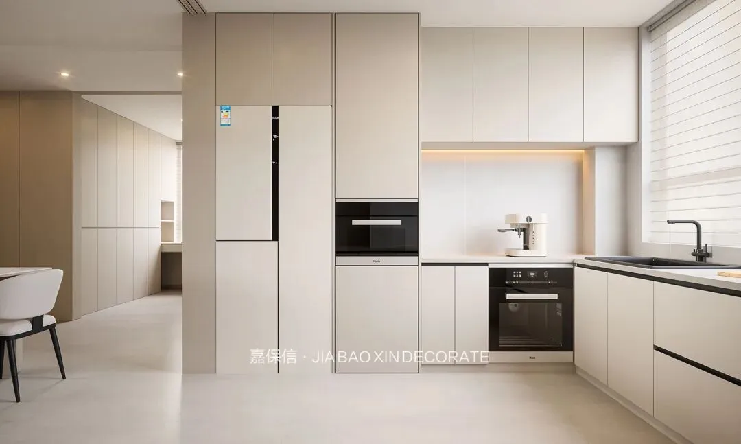 厨房没有繁复的装饰,只有简约的配色搭配内嵌的厨电与橱柜组合。墙面延续整体色调,视觉上形成连贯的整体,营造出整洁明亮的烹饪氛围。设计围绕真实生活需求展开,每一处细节都致力于让下厨更高效、更从容。