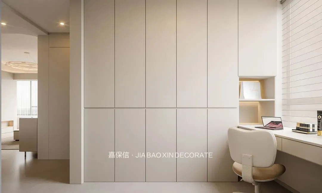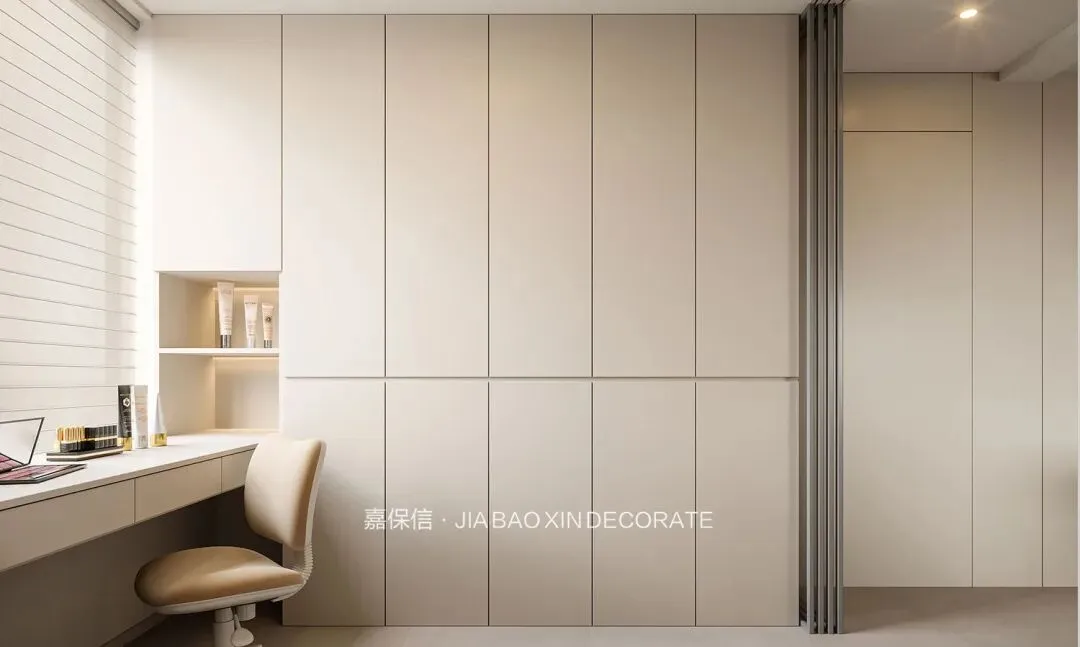 为满足梳妆与衣物收纳的需求,设立了衣帽间。折叠门可灵活开合空间,通顶收纳柜与悬空梳妆台自然相连,靠窗布局搭配百叶帘,让阳光温柔漫入,满室皆是暖意。墙面还设有壁龛式柜体,为化妆品提供了专属的收纳空间。