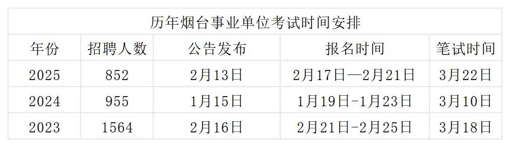 2025烟台事业单位招聘已经结束,根据往年情况,2026烟台事业单位统考招聘公告预计1月发布公告,3月笔试。一年一次入编机会,考生不要错过哦。