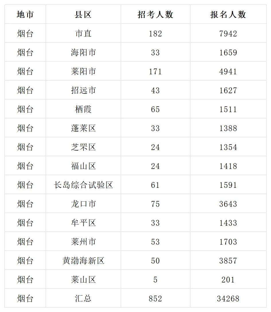 以2025年为例,2025年烟台事业单位招聘852人,报名3.4万余人,平均竞争比40:1。低于全省65:1的平均竞争比。