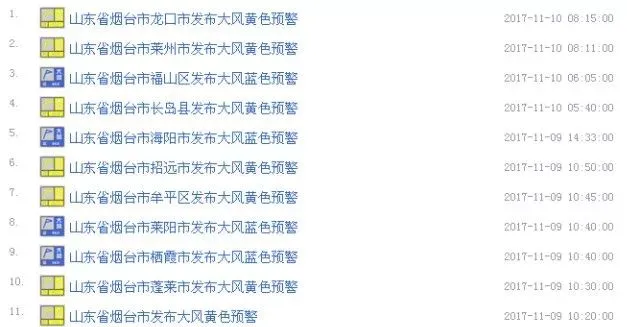 其中烟台市气象台连续发布