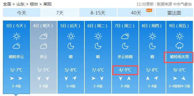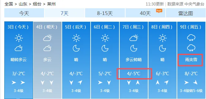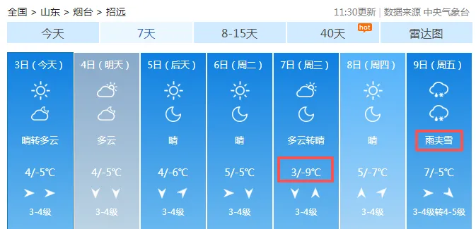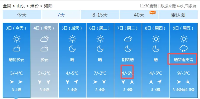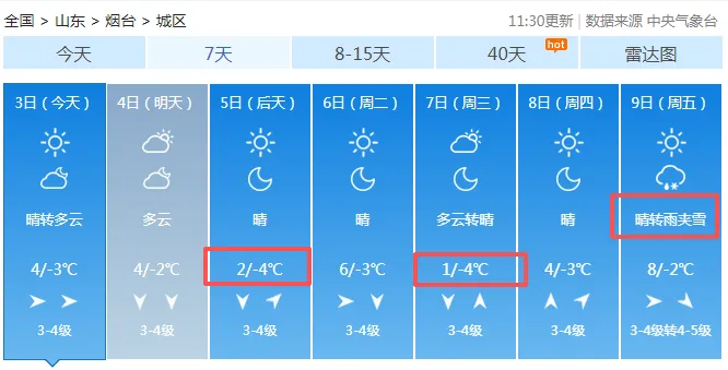 今天夜间到明天白天,晴转多云;偏西风转北风3~4级;最高气温4℃,最低气温-3℃。