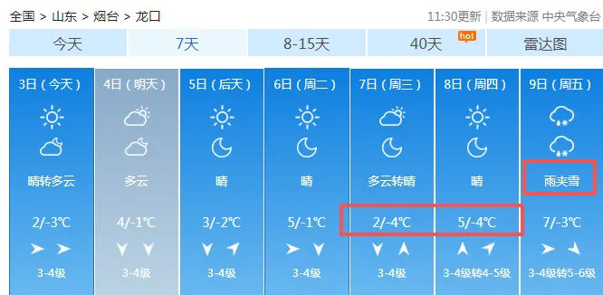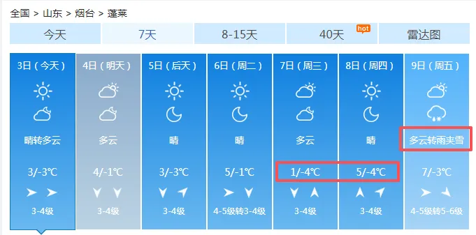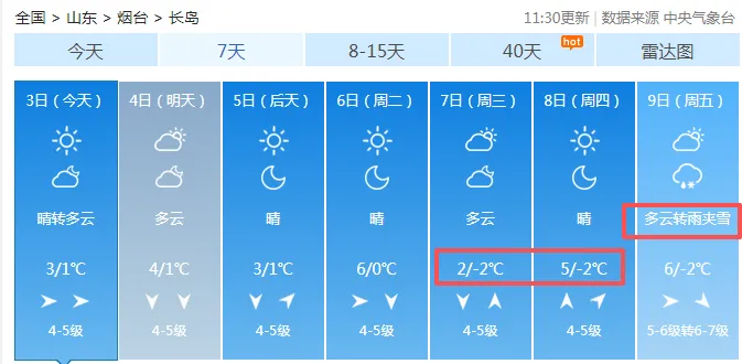 今天夜间到明天白天,晴转多云;偏西风转北风,沿海及内陆3~4级;最高气温,沿海4℃,内陆5℃,最低气温,沿海-3℃,内陆-7℃。
