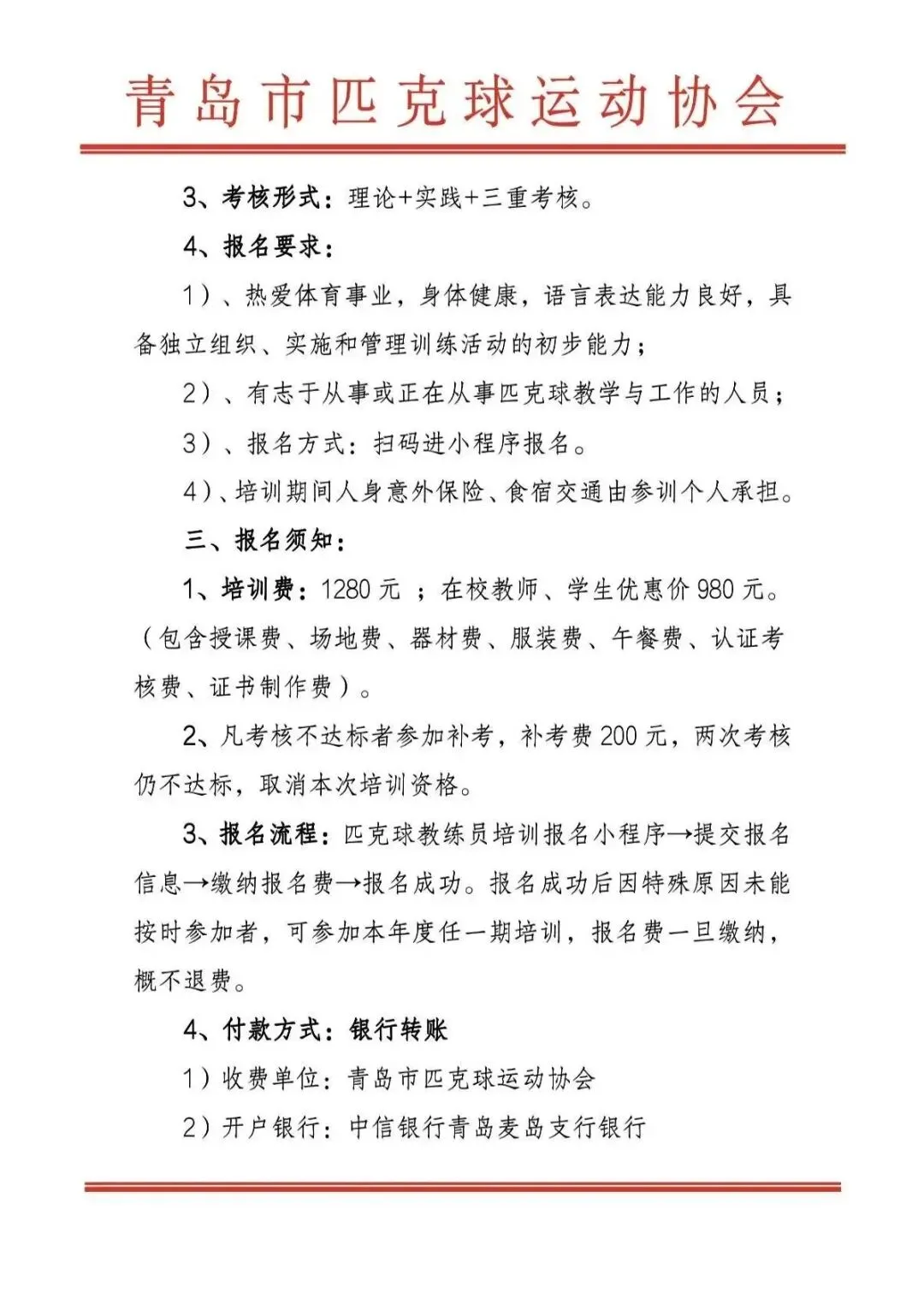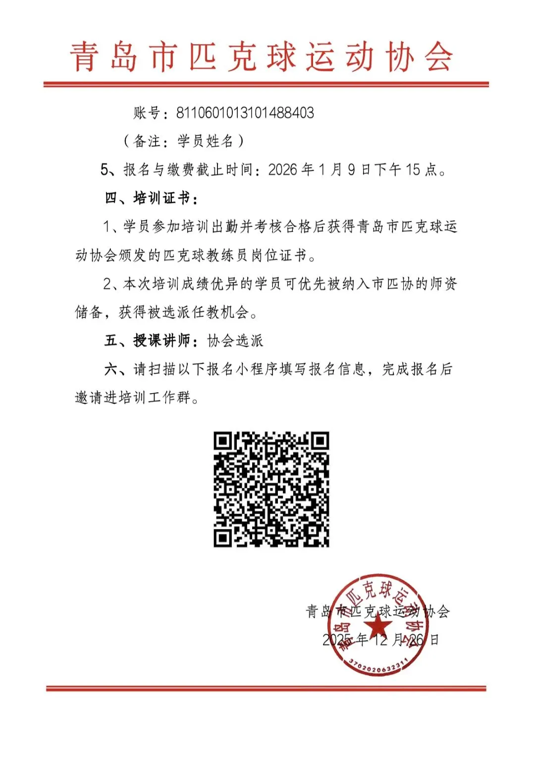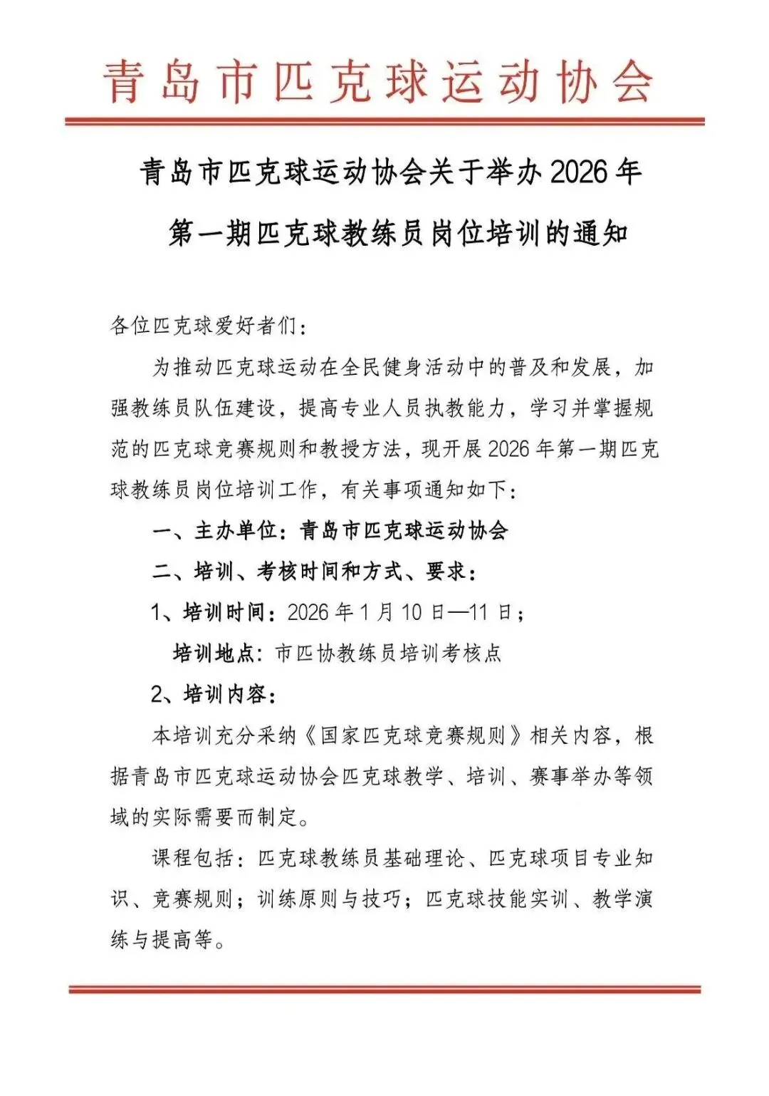 >青岛市匹克球运动协会关于举办2026年第一期匹克球教练员岗位培训的通知