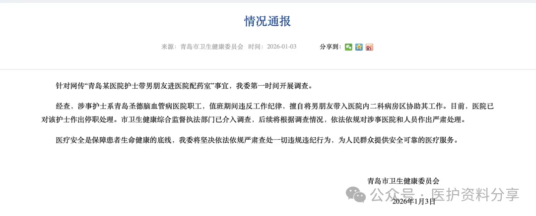 1月3日,青岛市卫健委终于发布通报,涉事护士已被停职,监督执法部门介入调查,后续将依法依规严肃处理。