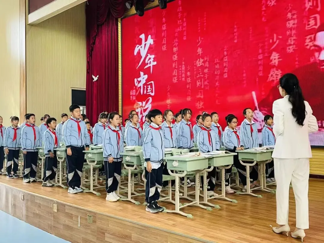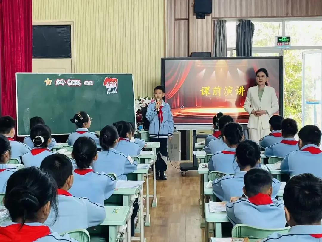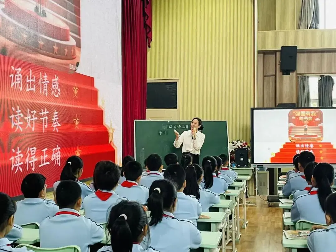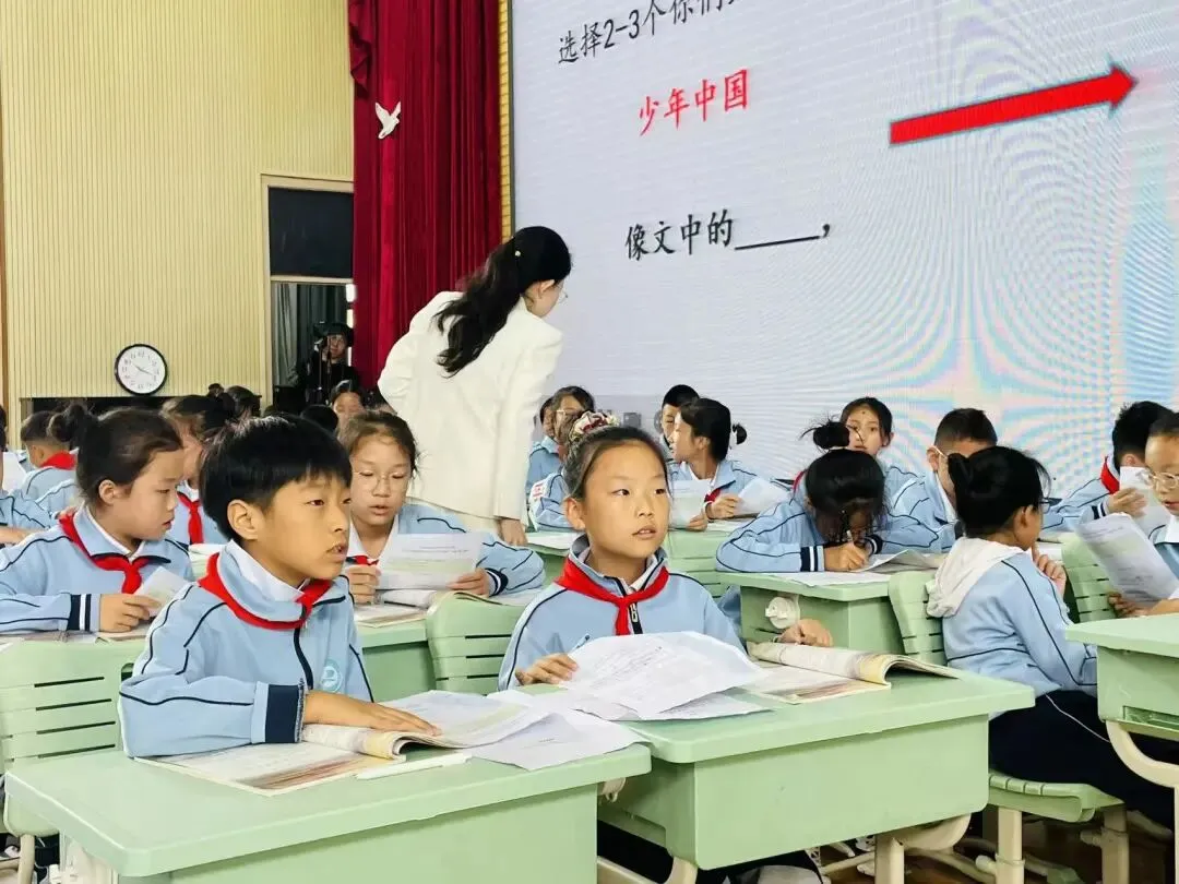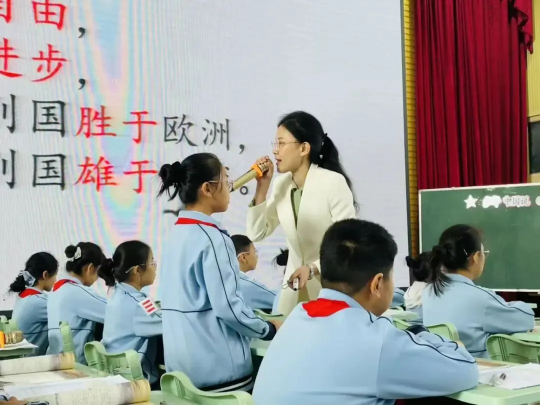 城阳区红岛街道中心小学董雅琦老师执教《少年中国说》(节选)(第二课时)。董老师以单元“家国情怀”人文主题与高阶朗诵能力培养为导向,创设“‘强国有我’主题朗诵会压轴之作打造”情境,以“读连贯显气势—懂意象悟情感—明责任诵强音”为教学脉络,层层递进开展学习活动。课堂上,董老师巧妙引导学生结合“八国联军侵华”“《辛丑条约》”等历史资料,通过解析“红日初升”“乳虎啸谷”等意象的象征意义,沉浸式理解“少年中国”与“中国少年”的辩证关系,让梁启超先生的强国呐喊转化为学生的责任担当。