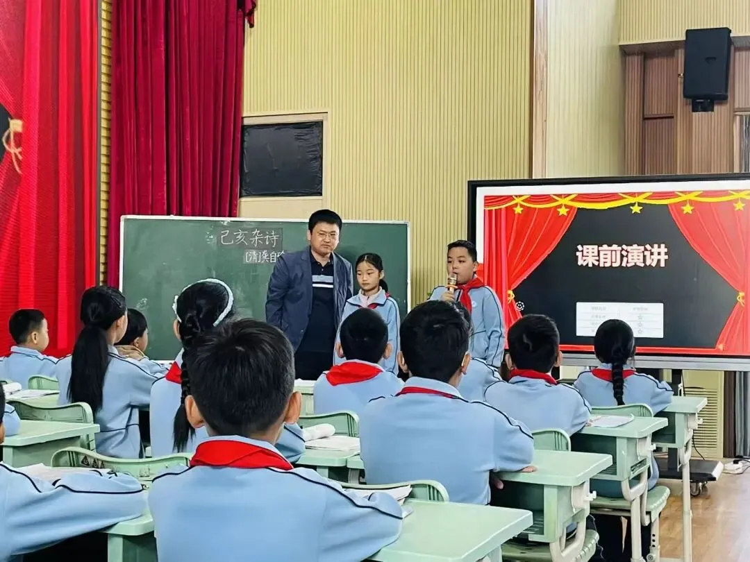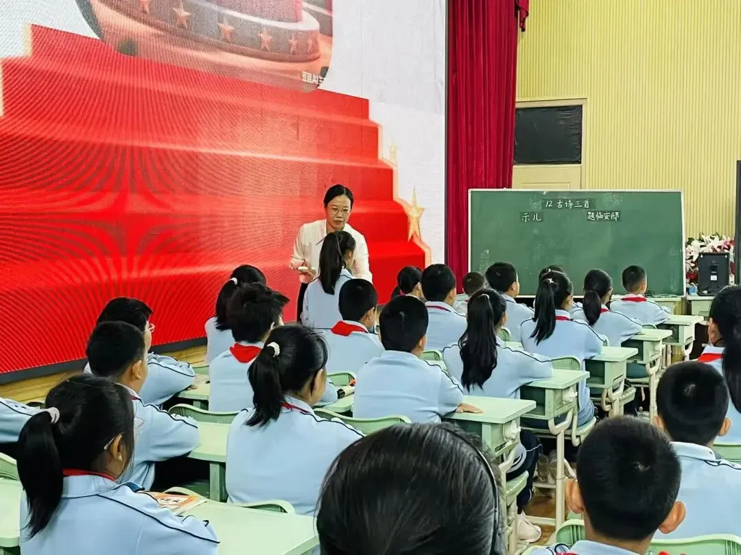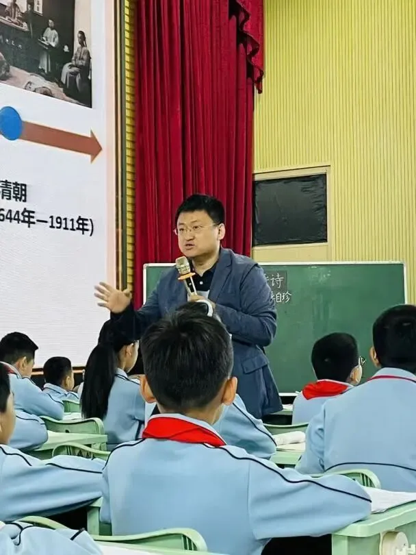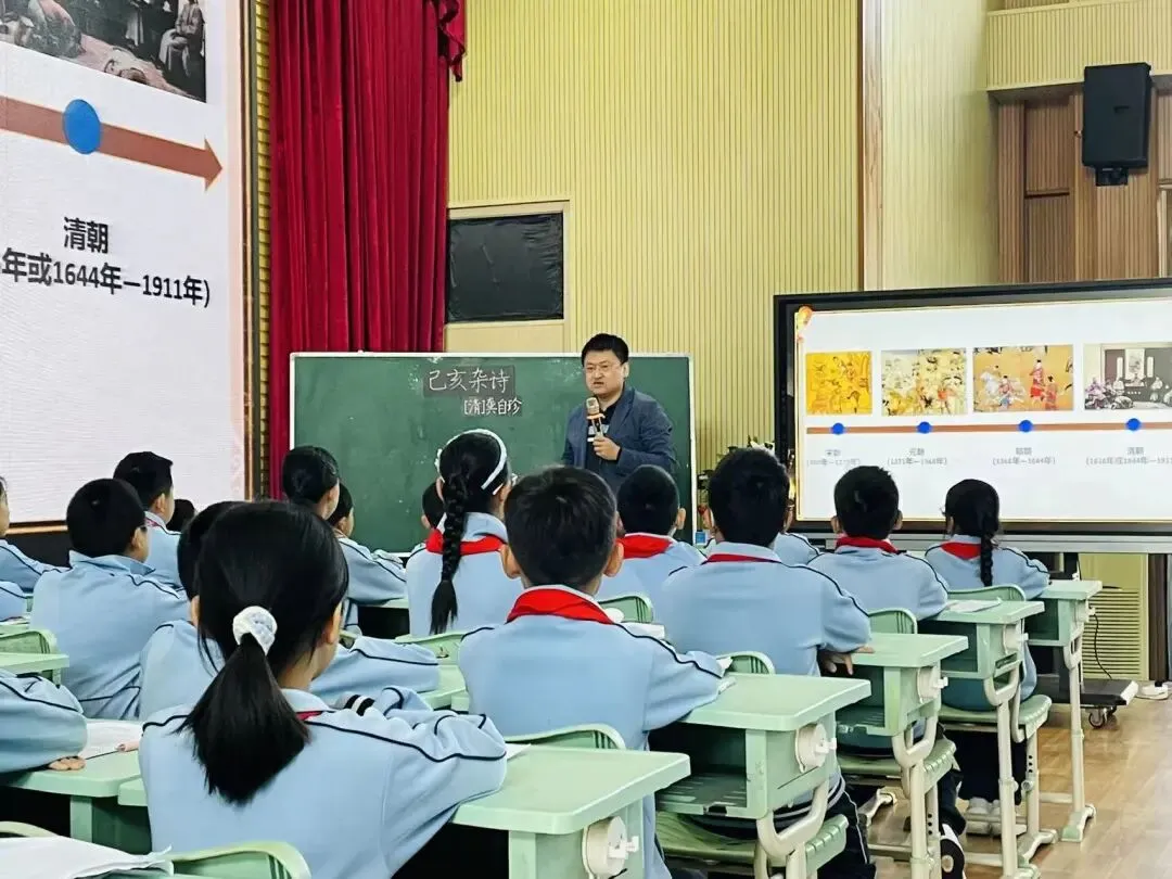 崂山区沙子口小学戴正龙老师执教《己亥杂诗》。戴老师以单元“结合资料,体会思想感情”核心要素为导向,创设“‘强国有我’主题朗诵会三星挑战”情境,以“读得正确—读好节奏—诵出情感”为教学脉络,层层递进开展学习活动。课堂上,戴老师巧妙引导学生借助1839年时代背景、龚自珍改革主张等资料,通过分析“风雷”“万马齐喑”的象征意义,沉浸式感受诗人从“悲哀”到“渴望变革”的情感转变,让清代文人的家国担当与变革精神在学生心中扎根。
