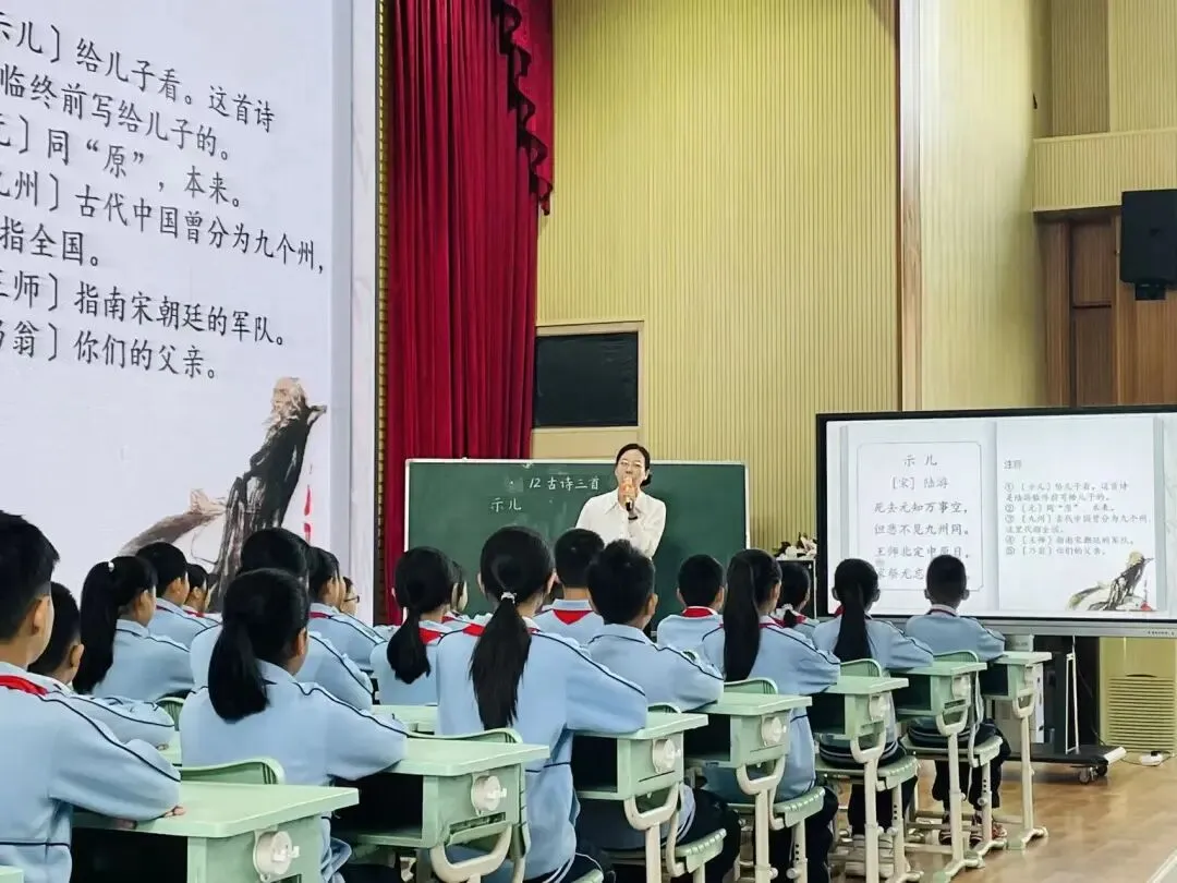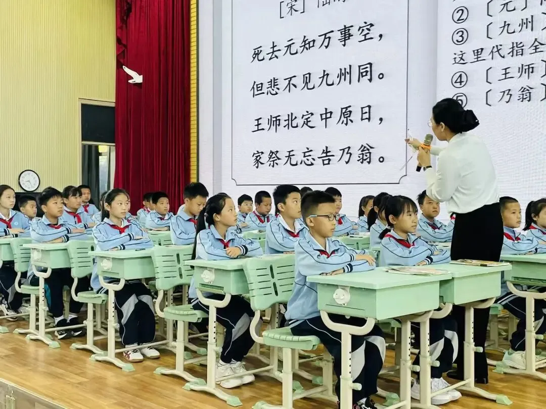 城阳区夏庄街道黄埠小学牟婷婷老师执教《古诗三首》(第一课时)。牟老师以五年级上册第四单元“家国情怀”人文主题与“结合资料,体会思想感情”语文要素为导向,创设“‘强国有我’主题朗诵会”情境,以“读准字音—理解诗意—体会情感”为教学脉络,层层递进开展学习活动。课堂上,牟老师巧妙引导学生结合“靖康之耻”历史背景、陆游生平资料,通过对比《示儿》的“悲”与“盼”、《题临安邸》的“讽”与“愤”,沉浸式感受诗人的爱国情怀,让古诗中的家国大义跨越时空,直抵学生心灵。
