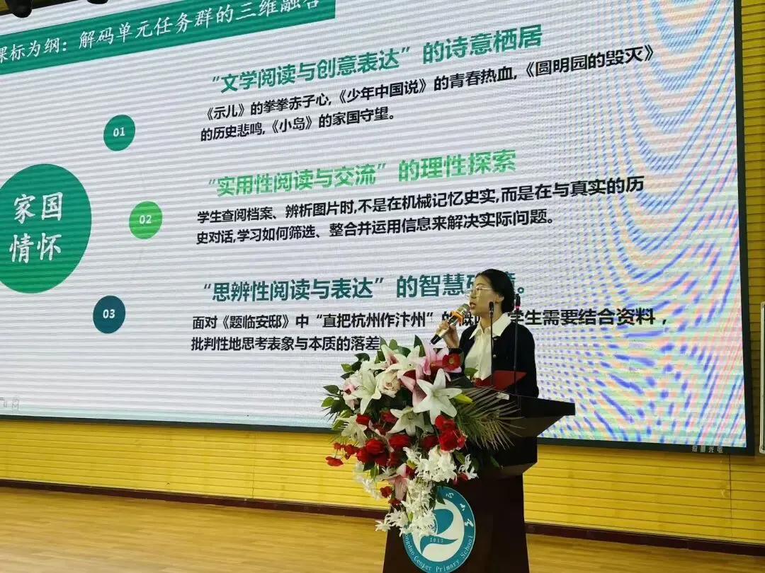 最后,青岛市城阳区流亭街道流亭小学袁月老师以《从“知意”到“共情”:基于多维资料运用的阅读素养提升实践》为题进行经验交流。她提出,资料运用需聚焦“查阅有向、使用活用、思维生成”核心,紧扣单元“家国情怀”主题与“结合资料悟情感”要素,构建“知意-共情”思维链。并以五上第四单元教学为例,演示通过“三维四型资料指南、‘靶向搜集-分层对话-延展实践’策略、五环思维链”,让资料成为情感桥梁,实现阅读素养从“懂文意”到“深共情”的进阶。