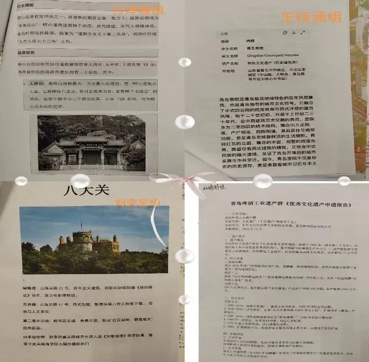 活动中,同学们严格遵循文化遗产申报规范,分组完成从资料搜集到报告撰写的全流程:付泽瞳组溯源崂山道教建筑的千年脉络,剖析木质结构腐蚀、石刻风化等保护难题。