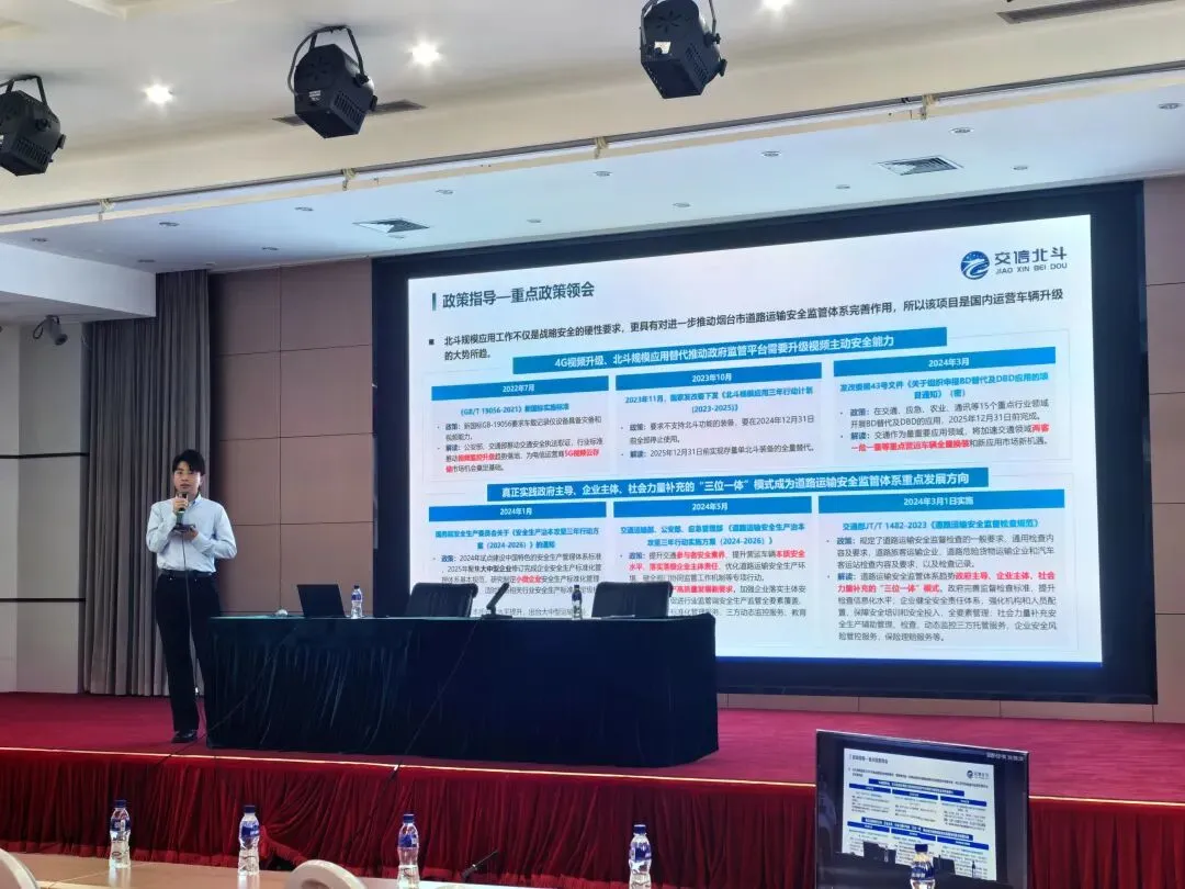 会上,交信北斗北区商务经理王雷围绕“重点营运车辆北斗规模应用方案”进行专题讲解,系统解读了政策导向下的行业趋势,详细剖析了方案落地的具体实施路径。他指出,“北斗智能终端+智慧监管平台+分级风控服务”三位一体的智能安全风控模式,对于降低营运车辆安全事故率、提升道路运输安全水平具有积极意义。