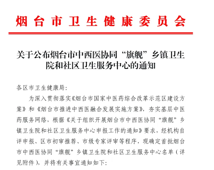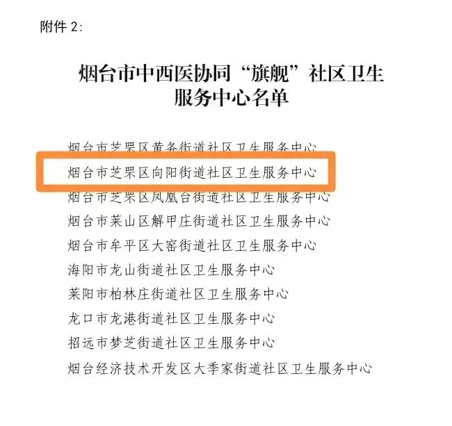 近日,烟台市卫生健康委员会发布了《关于公布烟台市中西医协同“旗舰”乡镇卫生院和社区卫生服务中心的通知》,向阳街道社区卫生服务中心凭借扎实的中西医结合服务基础和特色优势,成功获评“烟台市中西医协同旗舰社区卫生服务中心”称号。这标志着中心在中西医协同服务能力建设上取得了市级认可,进入了新的发展阶段。