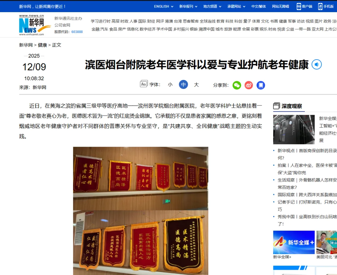 近日,在黄海之滨的省属三级甲等医疗高地——滨州医学院烟台附属医院,老年医学科护士站悬挂着一面“尊老敬老真心为老,医德医术皆为一流”的红底烫金锦旗。它承载的不仅是患者家属的感恩之意,更铭刻着烟威地区老年健康守护者对不同群体的普惠关怀与专业坚守,是“共建共享、全民健康”战略主题的生动实践。