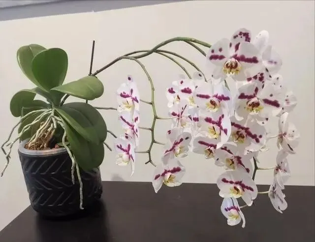 15年 , 一棵蝴蝶兰 , 10层叶子 , 20片全是肥的 , 根系油亮 , 花开爆盆。