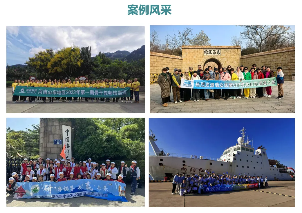 公司秉承“高效服务,诚信合作,创新共赢”的经营理念,响应践行国家政 策,一切以客户的需求为中心,可根据各大企事业单位以及不同层次游客的需 求,设计不同的专业路线,组织各种会议培训,研学旅游。与青岛多家保险企业 达成战略合作伙伴关系,公司先后接待及组织近十万游客的出行活动。